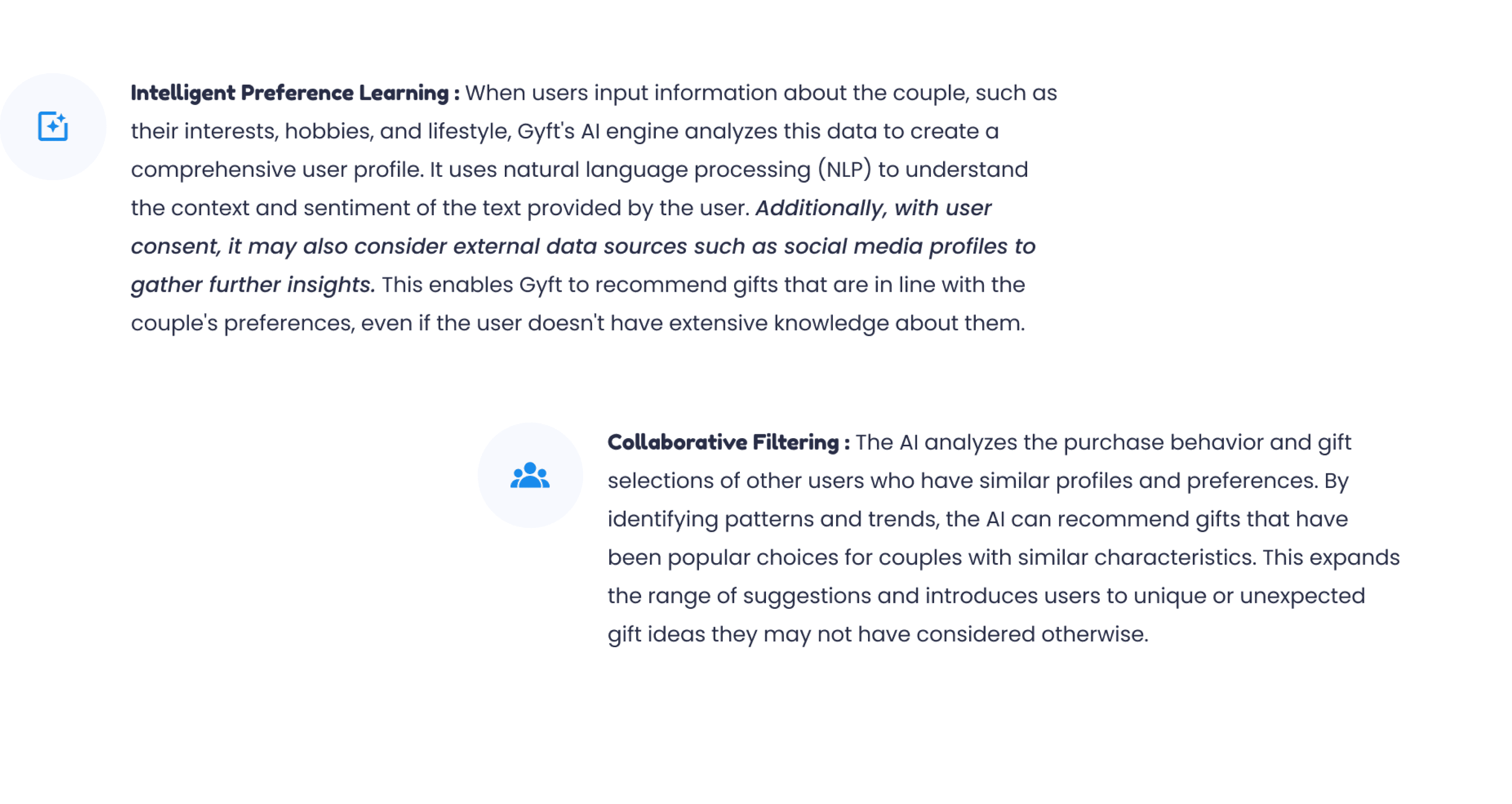 Gyft is a mobile app that utilizes AI to assist users in finding the ideal wedding gift for their loved ones. It goes beyond a basic gifting platform by providing personalized recommendations, intelligent suggestions, and effortless gift management, all powered by advanced artificial intelligence.